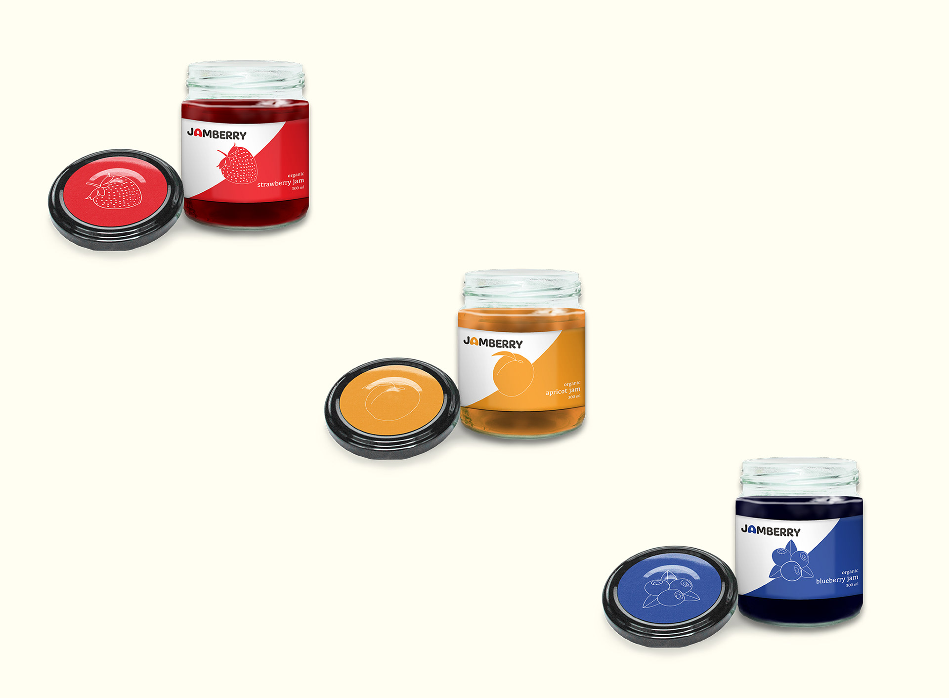 The packaging and label colours were chosen for their vibrancy and high visibility on supermarket shelves, in addition to representing the jam’s flavours – berry red (strawberry), purply-blue (blueberry), and orange-yellow (apricot).